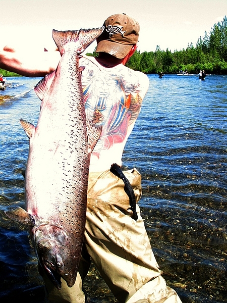 Accepting this is not C&R fishing, one can easily imagine what the angler is doing, namely shouting to the other anglers, "guys there are no fish here, I saw a couple of angry grizzlys chasing the salmon away this morning".