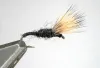 Later my friend and I ran into problems on our favorite stream, when the tiny Caënis dayflies hatched. The trout sipped the fresh emerged flies all over the water - but they rejected all the flies we offered. Then we found a note in a magazine saying, that the fly with the peculiar name - the 'Grey Duster' - should be the right medicine, if it was tied with a parachute hackle. |